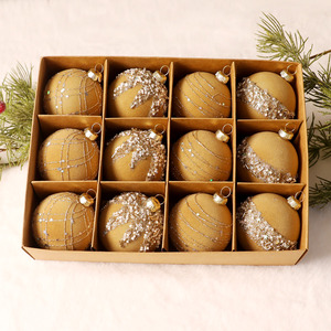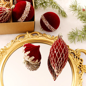 跨境现货6cm一盒12个新圣诞球质感植绒彩绘球精致圣诞树挂件酒红