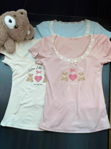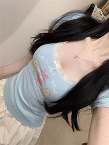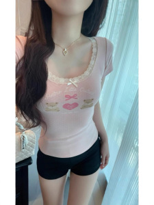 甜美蕾丝花边短袖t恤女肌理感圆领显瘦美式bm上衣纯欲系粉色上衣