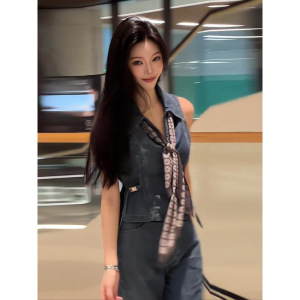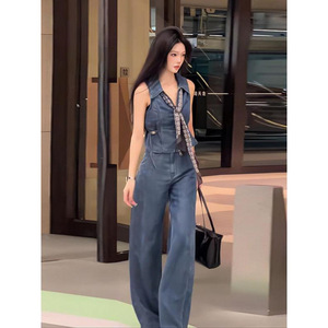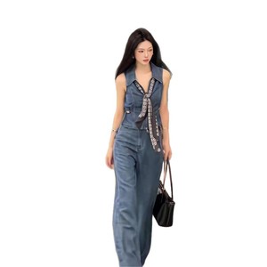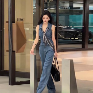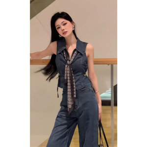 2025夏季牛仔套装POLO翻领设计收腰显瘦无袖上衣+高腰阔腿裤套装