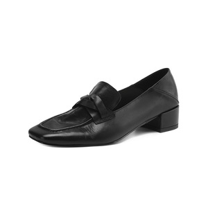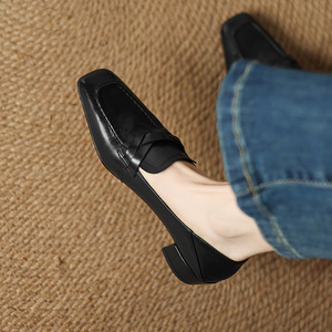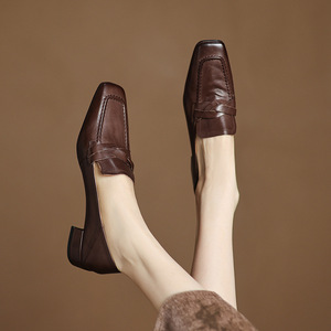 粗跟3.5复古水洗牛皮一脚蹬乐福鞋女2025春秋深口单鞋方头小皮鞋