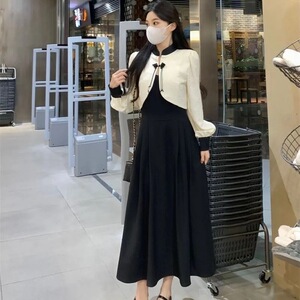 秋冬装新款新中式大码收腰连衣裙两件套中国风时尚百搭小黑裙套装