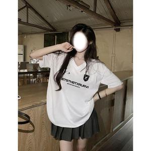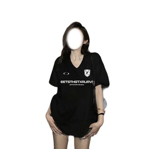 レイジースタイルアメリカンレトロVネックブラック半袖Tシャツ女性用夏ファットmm大きいサイズルーズスリミングルーズトップ