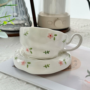 ins风手捏陶瓷咖啡杯碟 下午茶手绘碎花朵高颜值拉花拿铁水杯子