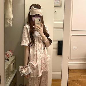 可爱hello kitty印花冰丝睡衣女款夏季新款短袖长裤家居服两件套