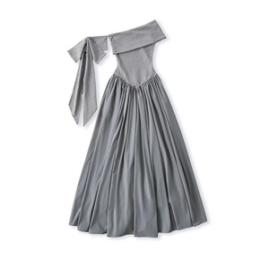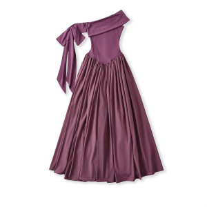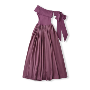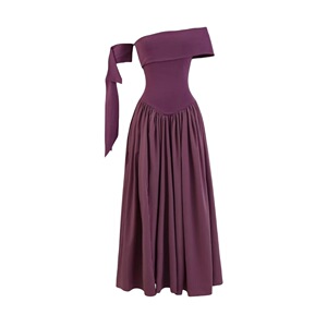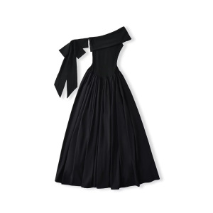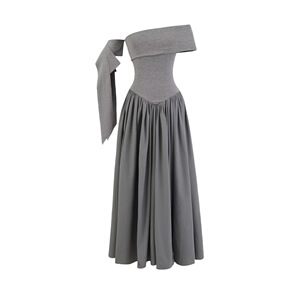 法式纯色一字领露肩连衣裙女斜肩飘带修身拼接褶皱大摆裙长裙高个
