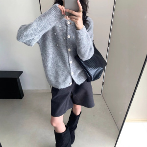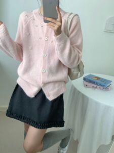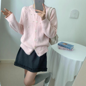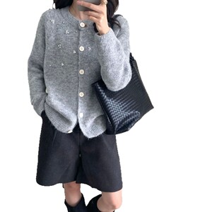韩系时尚慵懒风圆领毛衣外套女春秋冬设计感重工钉珠针织女开衫潮
