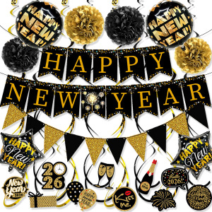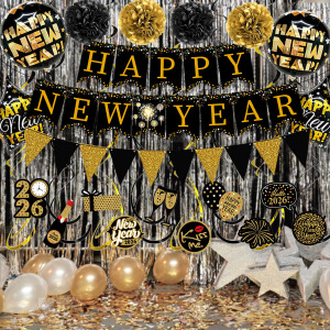 新年元旦主题派对装饰跨年晚会布置黑金拉旗螺旋气球套装批发定制