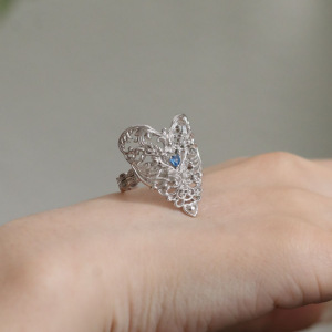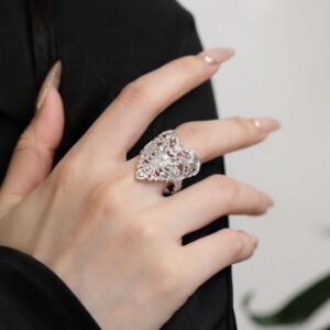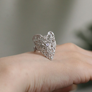 S925银肌理浮雕镶锆镂空爱心戒指开口