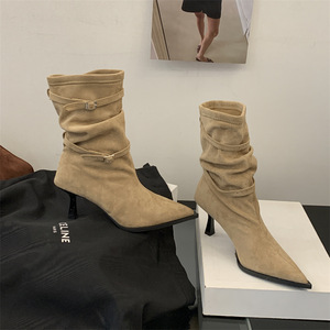 富贵一足尖头细跟绒面法式瘦瘦短靴时装扣带卡其色中筒褶皱堆堆靴