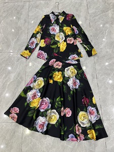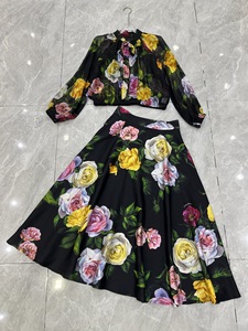 奢华黑底玫瑰与芍药花19姆米真丝双大裙摆真丝半裙配时尚上衣套装