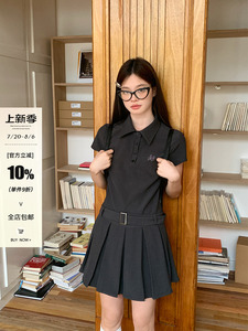 宋正恩polo领短袖衬衫连衣裙女夏季学院风气质收腰百褶灰色短裙子