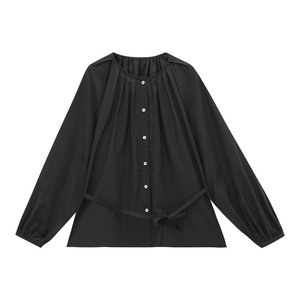 广州十三行2025秋韩宽松系绳收腰单排扣天丝圆领长袖衬衫女02821