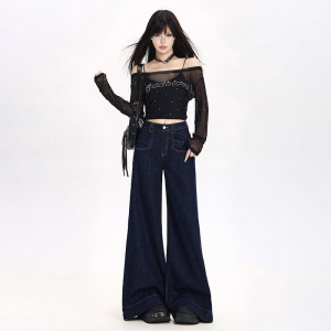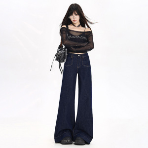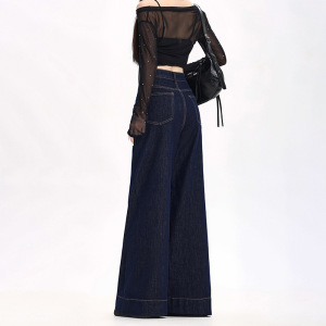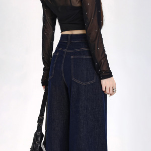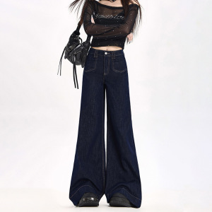 女性用ダークブルーワイドレッグジーンズ、ハイウエスト、2025春秋の新スタイル、ゆったり、スリム、多用途、フロアレングスストレートパンツ
