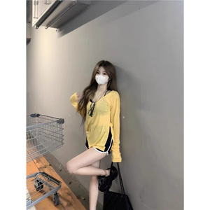 スイートドーパミンウェアニット長袖ブラウストップイエローTシャツレディース夏ラージラウンドネック非対称日焼け止めシャツ