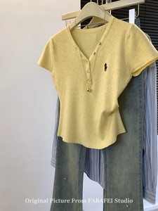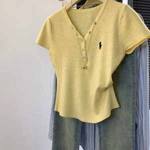 zdm プラスサイズ 150kg 個別におすすめ〜ポニー刺繍半袖 Tシャツレディース夏ボタン V ネックニットトップスイン