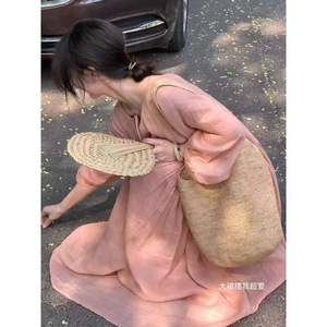 早秋新款粉色纯苎麻纯色大码V领系带连衣裙宽松女裙子