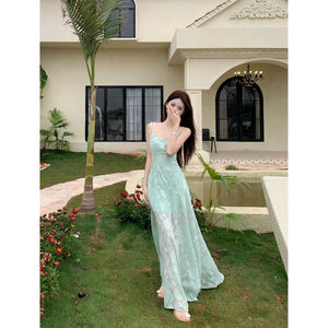 フレンチミントグリーンレースサスペンダードレスレディース夏気質ウエストAラインスカート海辺リゾートスタイルロングスカート