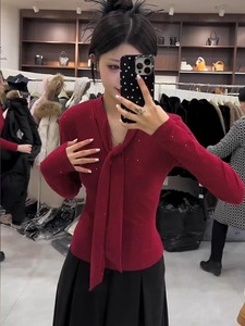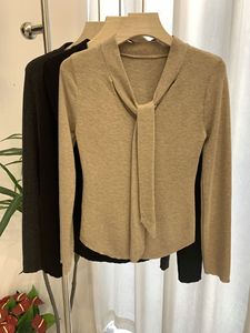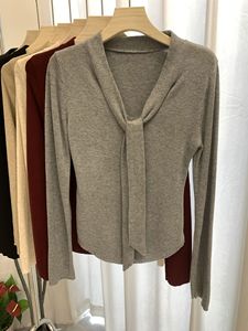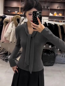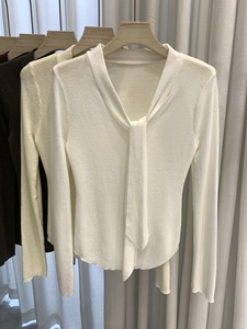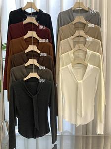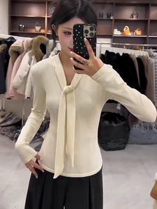 韩系氛围感V领长袖打底衫女春秋内搭修身显瘦温柔高级感飘带上衣