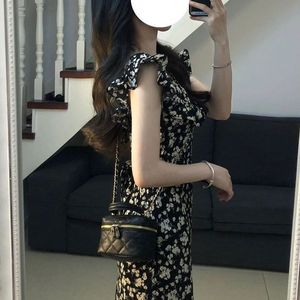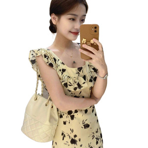 ティーブレイクフレンチフライスリーブ花柄ドレス女性の夏の新しいファッションデザインウエスト痩身ロングスカートミドル丈スカート