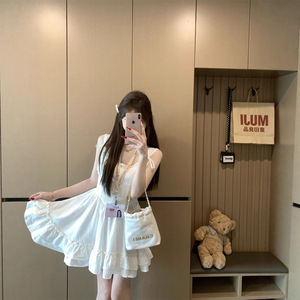女装夏季2025白色吊带连衣裙度假风时尚设计蕾丝拼接收腰a字短裙