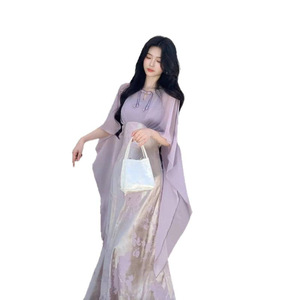 【垂云赋彩】 新中式飘逸披肩连衣裙收腰缎面提花鱼尾长裙夏国风