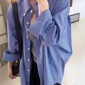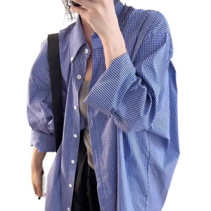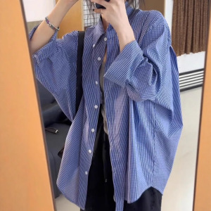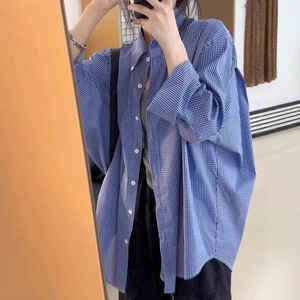春夏新款韩版宽松显瘦蓝色格子衬衫女长袖大码百搭休闲慵懒风衬衣