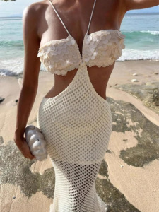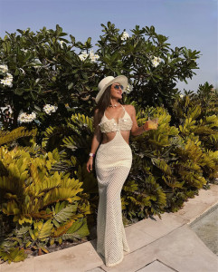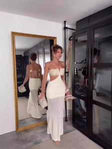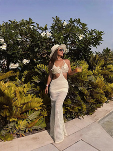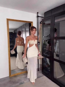 insクロスボーダーヨーロッパとアメリカのカジュアル休暇セクシーなスリムウエストホルターネックストラップスパンコールディープVシースルー日焼け止めドレス