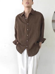 棕色棉麻衬衫男口袋款宽松长袖防晒开衫薄款透气亚麻休闲工装衬衣