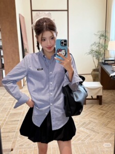 南油高品质MM家胸前贴布字母格纹衬衫高定百搭简约潮流学院休闲长