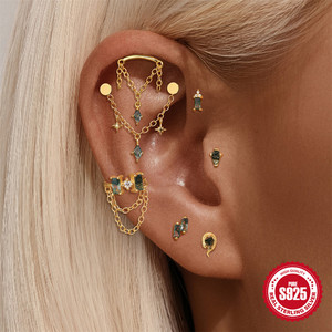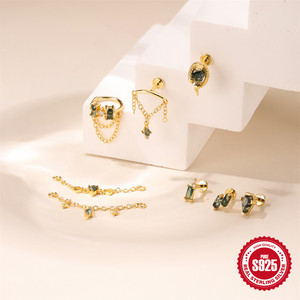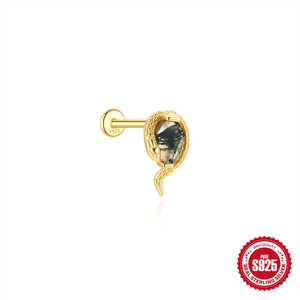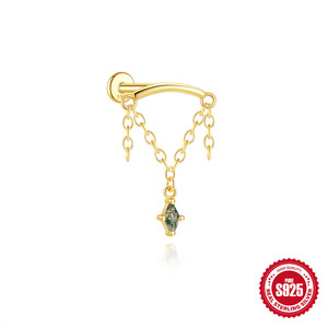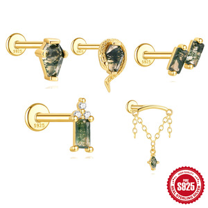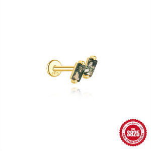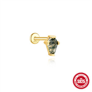 S925纯银天然水草玛瑙几何菱形平头螺纹穿刺耳骨钉欧美热销耳饰品