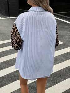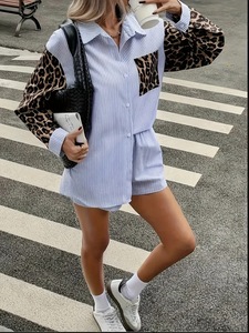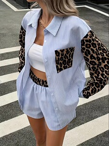 2025欧美跨境外贸女装舒适休闲条纹豹纹拼接衬衫衬衣短裤两件套装