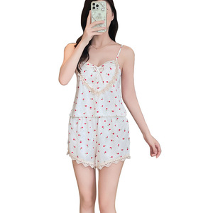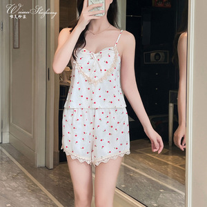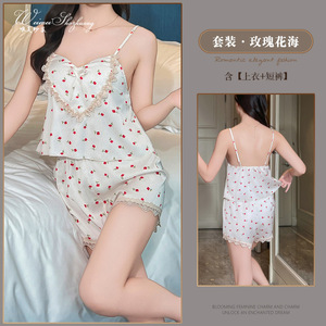 唯美纱夏季新款家居睡衣女纯欲吊带短裤两件套玫瑰花甜美家居套装
