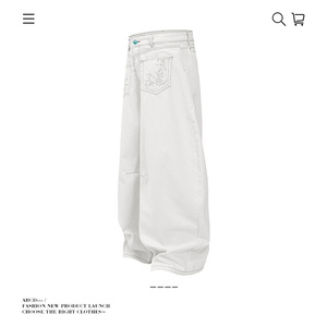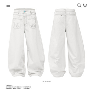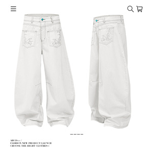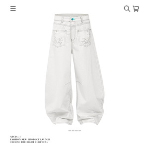 baggy美式复古弯刀设计白色牛仔裤男高级感明线撞色阔腿宽松长裤