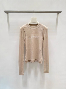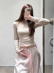 正确版2025早秋新款字母印花螺纹拼接修身假两件长袖T恤打底衫女