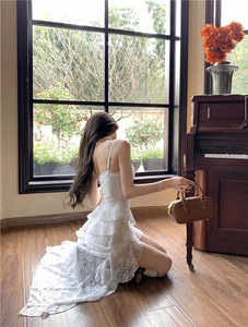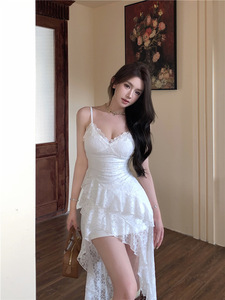 纯欲辣妹风不规则下摆开叉连衣裙浪漫氛围感修身蕾丝吊带短裙夏季