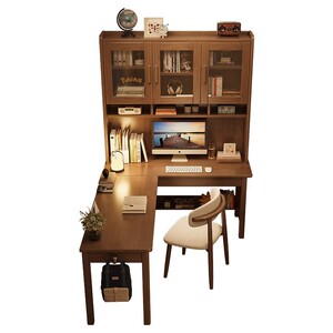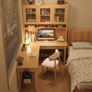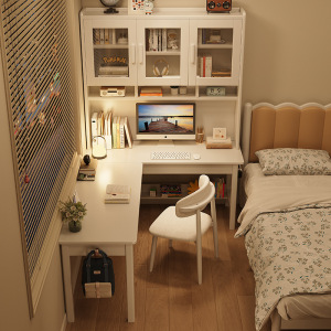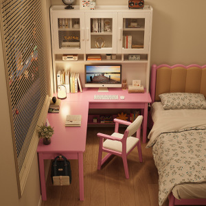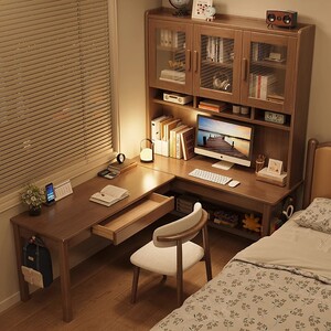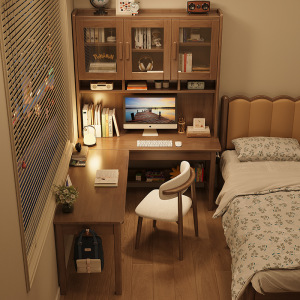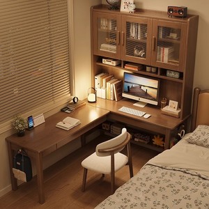 实木转角电脑桌卧室学生家用书桌书架一体桌双人学习桌拐角办公桌