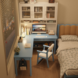 蓝白色单桌+16#升降椅+书架【双侧实木挂钩】