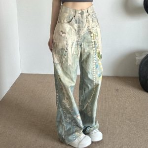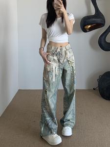 高版本AC25新款3D打印蕾丝珍珠链条直筒宽松高腰牛仔长裤男女