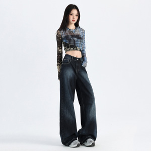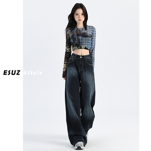 深蓝色渐变阔腿牛仔裤女夏季新款高腰宽松美式松弛垂感直筒拖地裤