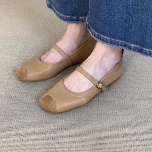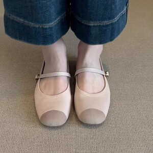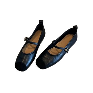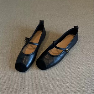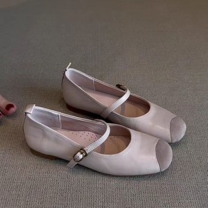 现货复古法式圆头拼接一字带玛丽珍单鞋女浅口通勤软底平底芭蕾鞋