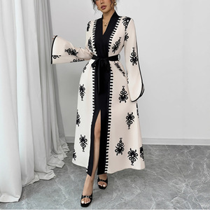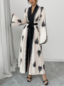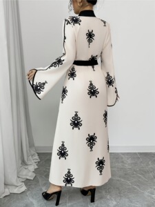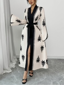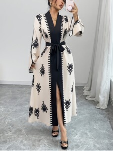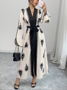 TEMU独立站外贸复古刺绣撞色长袖长款V领收腰系带气质通勤连衣裙