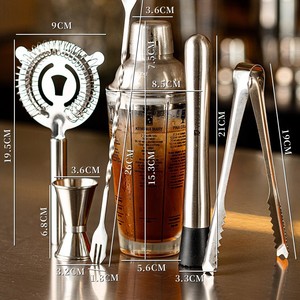 【6件套】600ml玻璃304雪克杯+32厘米304钢棒+304吧勺+冰夹+304钢量杯+滤冰器