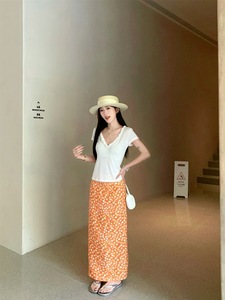 韩系穿搭套装白色v领短袖上衣女夏季碎花裙半身裙海边度假两件套