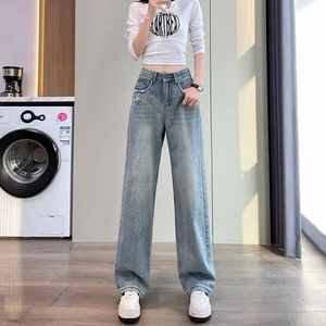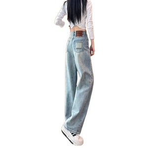 T5C浅蓝色高街破洞阔腿牛仔裤女宽松春夏季新款高腰直筒显瘦拖地