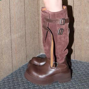 牛皮版~欧美辣妹厚底增高6cm长筒靴女复古皮带扣大筒围堆堆工装靴