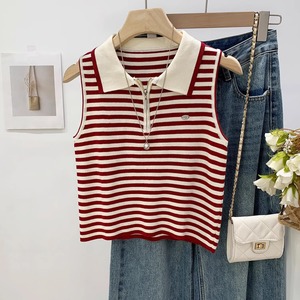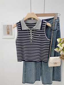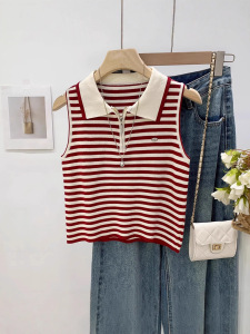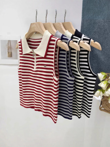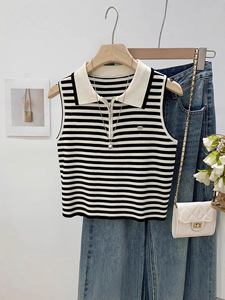 品牌外贸~剪标专柜法式条纹外穿短款针织背心女修身显瘦无袖上衣