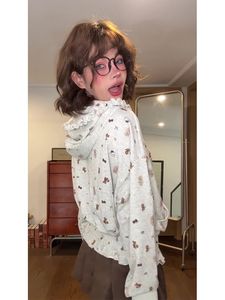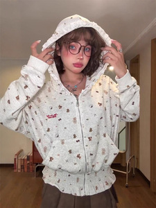 美式复古满印褶皱连帽卫衣女早秋新款慵懒风宽松开衫外套长袖上衣
