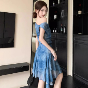 2025夏季新款轻熟风蓝色连衣裙女斜肩荡领无袖a字显瘦不规则短裙