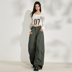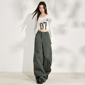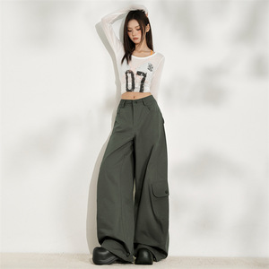 美式辣妹军绿色休闲裤女秋季新款宽松简约高腰显瘦多口袋工装裤子