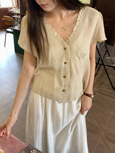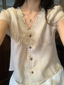 広州黄正韓国スタイル V ネックレースシャツ女性のための 2025 夏甘いスタイルルーズ痩身シャツ女性のための 142CH446